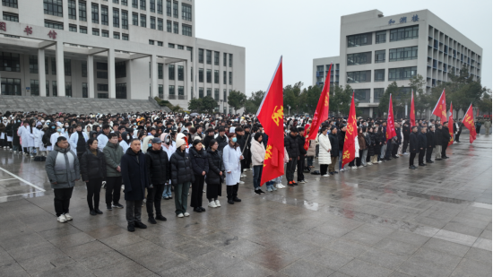 清晨7时,在濛濛细雨中,英姿飒爽的国旗护卫队队员迈着矫健的步伐护送国旗入场。在雄壮的国歌声中,五星红旗冉冉升起,飘扬在校园上空,全体师生行注目礼,向国旗致以最崇高的敬意。
